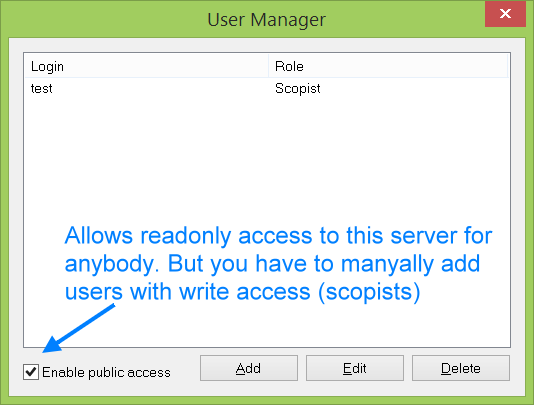 It is recommended to keep"Enablepublic access" checkbox turned on, this allows users with any login/password connect toyoucomputer in readonly (viewing) mode.Soyou can add only accounts for your scopists in this case, and provide attorneys just with address or your computer and port to connect.