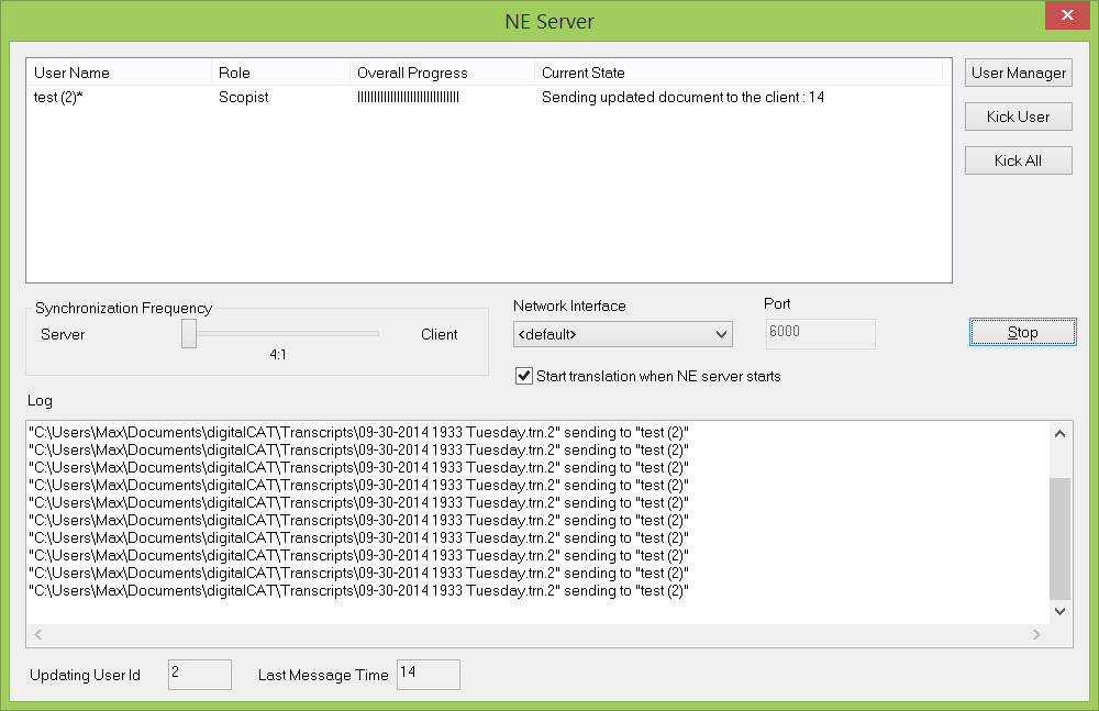 "Synchronization Frequency"means how often participantssendingchanges to each other. Bydefaultthis is 4:1 meaning that changes doing by reporter (server) has highest priority. I.e. server sends information about changes four times and once get changes from each scopist. This was done becausereporterdoing the most changes in transcript, so providing him with priority will allow all participants to have the most up to date transcript, while scopist's changes will be provided with small delay.